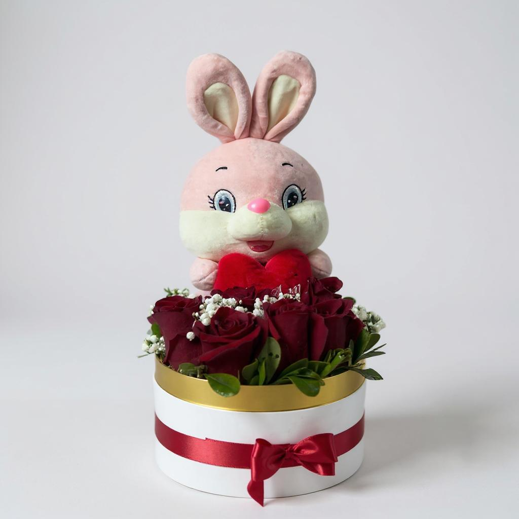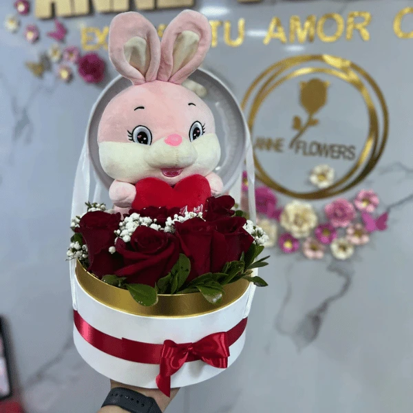 Encantadora caja con rosas rojas frescas y un adorable peluche de conejo sosteniendo un corazón. El regalo ideal para demostrar tu amor con ternura y estilo.