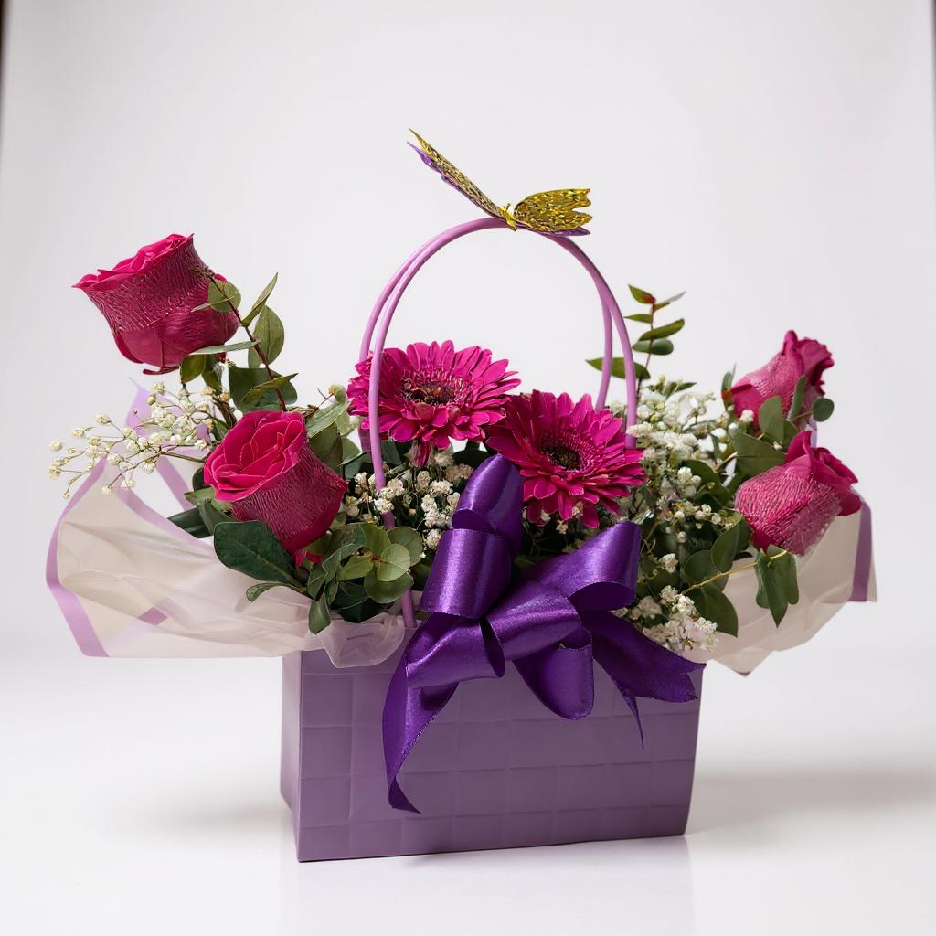 Cartera fucsia de rosas y gerberas