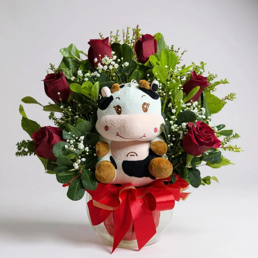 Pecera con 6 rosas rojas + peluche de vaca