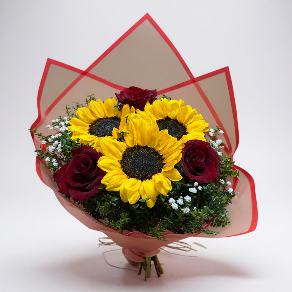 Ramo de 3 girasoles y 3 rosas papel rojo
