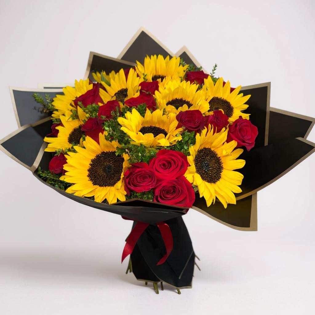 Ramo elegante con girasoles y rosas rojas, ideal para expresar amor o gratitud. Perfecto para ocasiones especiales, envuelto en papel negro con detalles dorados. ¡Un regalo que ilumina cualquier momento!.